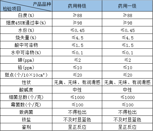 "海達(dá)牌"超細(xì)滑石粉是選用優(yōu)質(zhì)滑石礦為原料,經(jīng)過采選、水洗、風(fēng)干、破碎、研磨等工序加工而成。每道工序,都嚴(yán)格按照中國藥典2010版的操作規(guī)格和檢測標(biāo)準(zhǔn)進(jìn)行生產(chǎn),最終產(chǎn)品經(jīng)檢測合格后,才準(zhǔn)予包裝出廠。產(chǎn)品應(yīng)用于西藥、中成藥、糖漿輔藥.